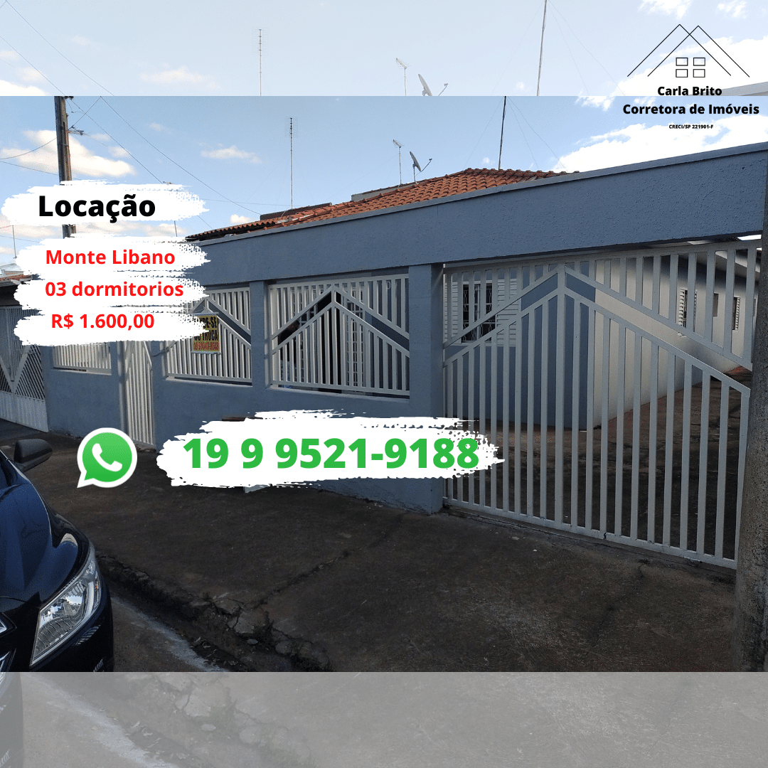 Casa para locação em Aguaí com 150m2 no Monte Líbano. 03 Quartos, sendo uma suite, 01 sala de estar, 01 sala de jantar, cozinha, 03 banheiros e garagem.